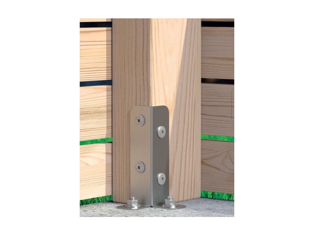 Hlavní výhodou patky PSB je její „otevřený“ rohový profil. Ten dovoluje sloup pevně přitisknout k opoře a zajistit jej bočními svorkami, což výrazně zrychluje tesařské práce. Pro upevnění v dřevěném trámu se doporučují vruty pro zahradní architekturu CTO nebo vruty PWD ø 10 mm. U konstrukcí podléhajících statickému posouzení dle Eurokódu 5 je certifikovaným řešením použití hřebíků s kulatým dříkem ø 4 mm. Tato patka je vhodná pro třídy použití 1, 2 a 3, což z ní činí spolehlivého partnera pro stavbu pergol, dělících stěn a přístřešků.