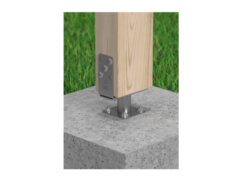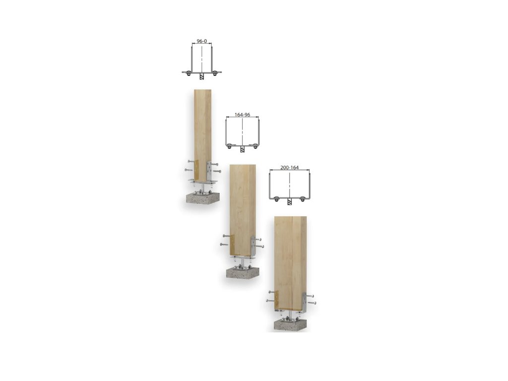 Hlavní výhodou modelu PSRT je možnost individuálního nastavení rozteče ramen U-profilu. To tesařům dovoluje plynule přizpůsobit patku šířce konkrétního sloupu až do 200 mm, což eliminuje problémy s rozměrovou nepřesností řeziva. Pro upevnění dřevěných prvků se doporučují vruty pro zahradní architekturu CTO nebo vruty PWD ø 10 mm. U staticky náročných spojů je certifikovaným řešením použití konvexních hřebíků ø 4 mm. Patka se kotví k podkladu pomocí šroubů nebo kotev (např. M10), což zajišťuje stabilní a dlouhodobě spolehlivé uchycení nosných sloupů.