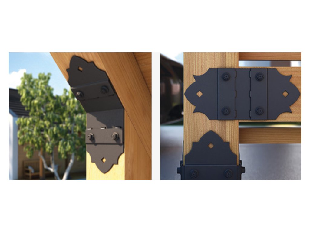 Základem je kalená uhlíková ocel, která zajišťuje vysokou pevnost spoje. Práškové lakování černé barvy je nanášeno profesionální technologií, která zaručuje odolnost proti poškrábání a stálost odstínu i při vystavení povětrnostním vlivům. Tento montážní set je ideální pro viditelné spoje na pergolách, altánech, vratech nebo zahradním nábytku, kde tvoří s černými úhelníky a plochými spojkami jeden harmonický celek.